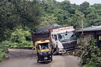 रत्नागिरी–कोल्हापूर महामार्गावर दाभोळे बाजारपेठेत सोमवारी रात्री कोळसा भरलेला ट्रक पुलाचा कठडा तोडून दुकानात घुसला. सुदैवाने कोणतीही जीवितहानी झाली नाही.