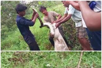 रत्नागिरी: विल्ये आवळीचा मोडा – आंब्याचे भाटले या ठिकाणी आज एक हृदयद्रावक आणि थरारक घटना घडली, ज्यात स्थानिक सर्पमित्र आणि गावकऱ्यांनी मोठे धाडस दाखवले. आंब्याचे भाटले येथील रहिवासी राजरत्न कांबळे यांचा बकरा एका महाकाय अजगराच्या तावडीत सापडला. बकऱ्याला अजगराने घट्ट विळखा घातला असल्याची माहिती मिळताच विल्ये परिसरात एकच खळबळ उडाली. तत्काळ, अक्षय जाधव (मेढे-सर्पमित्र) यांच्यासह विल्ये बौद्धवाडी येथील अनेक धाडसी महिला आणि पुरुष मदतीसाठी धावले.