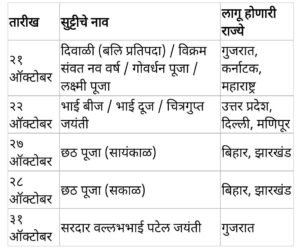 ऑक्टोबर महिन्यात दिवाळीनंतरही काही महत्त्वाच्या सणांमुळे बँकांना सुट्टी असणार आहे (राज्यानुसार सुट्ट्या बदलू शकतात).