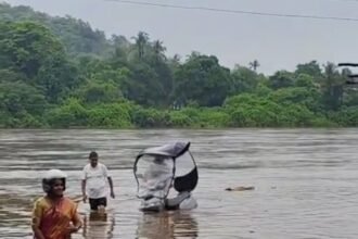 खेड: शहरात मंगळवारी सुरू असलेल्या मुसळधार पावसामुळे मटन मार्केट परिसर जलमय झाला. या परिसरातील भोसते रोडमार्गे आपल्या दुचाकीवरून जाणाऱ्या एका महिला नागरिकाने पुराचे पाणी असूनही मार्गक्रमण करण्याचा प्रयत्न केला. मात्र अचानक वाढलेल्या पाण्याचा प्रवाह इतका वेगवान होता की महिला आणि तिची दुचाकी पुराच्या लाटांमध्ये वाहून जाण्याच्या स्थितीत आली.